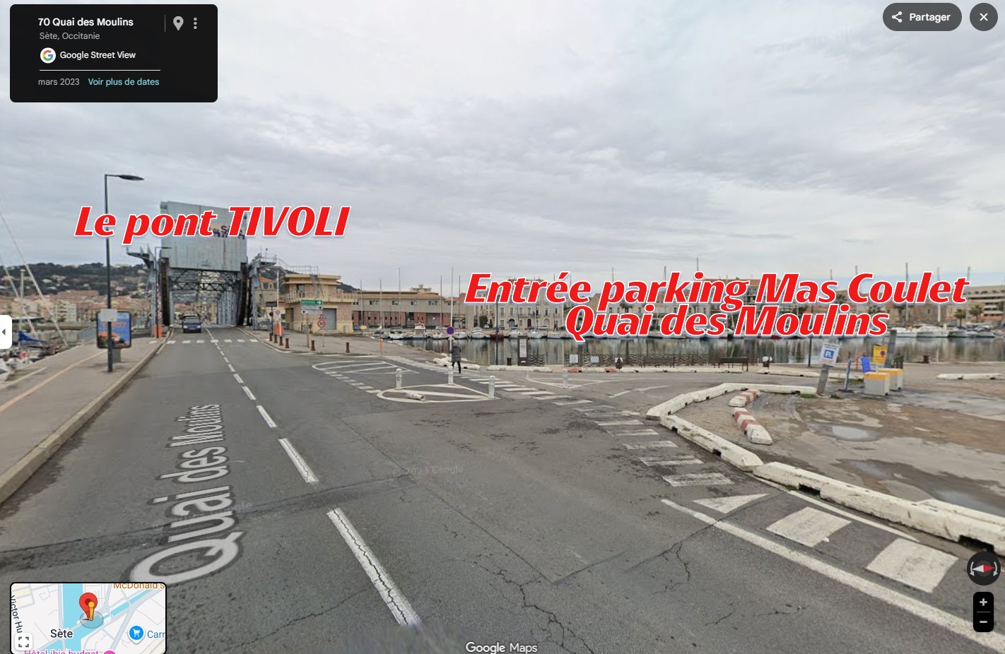 - Le rendez-vous à ne pas manquer est fixé à 9 h au parking gratuit - Mas Coulet, Quai des Moulins, le temps de trouver une place et à 9 h 20 environ devant le Pont TIVOLI, se situant à l'entrée même du parking. Nous devrons franchir le pont avant 9 h 30, Photo en bas de page :